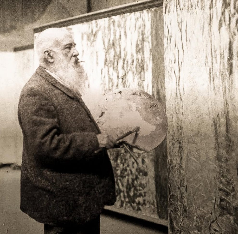 [World famous impressionist artist, Claude Monet, working on a painting in his studio.]
